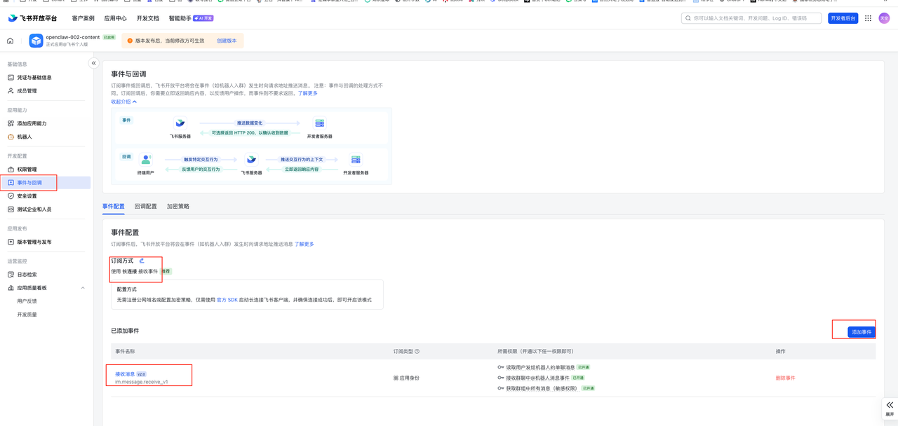 Under "App Features" -> "Bot", enable the bot. Then, in "Event Subscriptions", select "Use long connection to receive events" and add im.message.receive_v1.