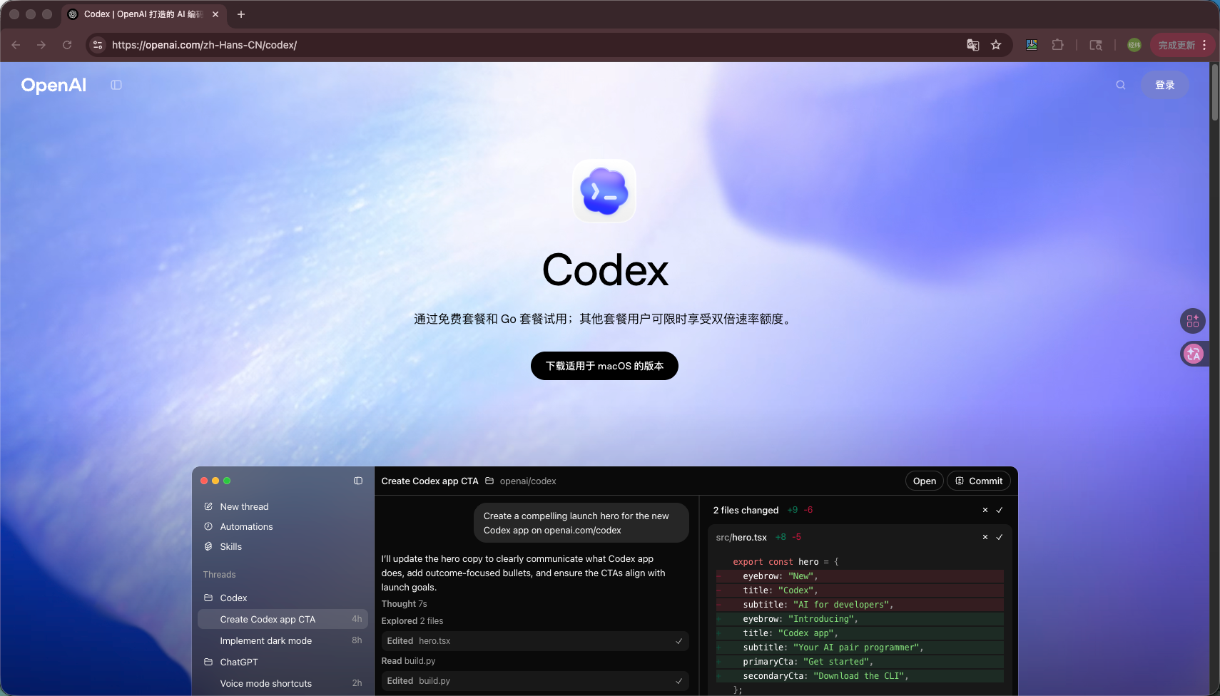 首先,打开你的浏览器,直接前往官方的下载页面。 👉 官方直达地址: https://openai.com/zh-Hans-CN/codex/