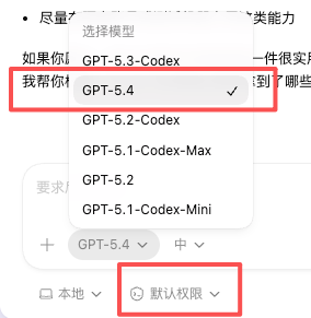 (图:在模型列表里切到 GPT-5.4,并记得打开下方的控制权限)