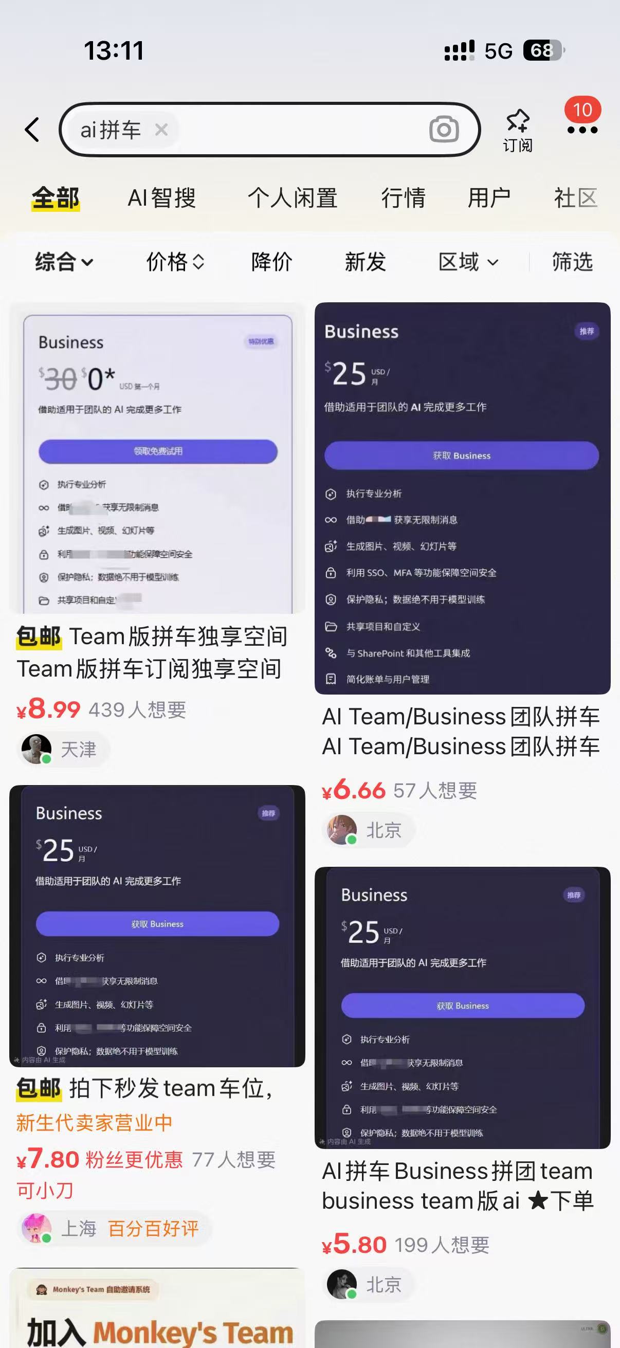 打开手机里的闲鱼 App,在搜索框里直接搜索关键字:“AI 拼车” 或者 “GPT 拼车卡密”。