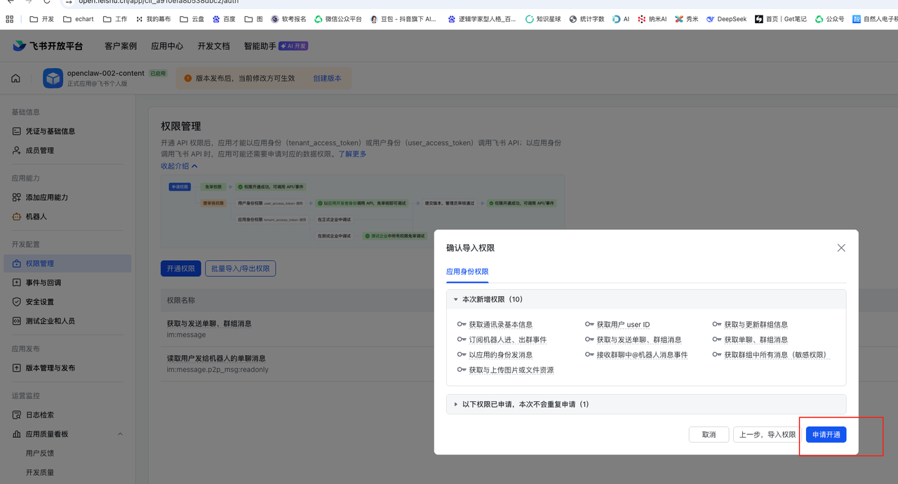 千万别忘了这一步!每次任何权限和订阅变动,都要去左侧找到「版本管理与发布」,创建一个新版本并 申请发布。