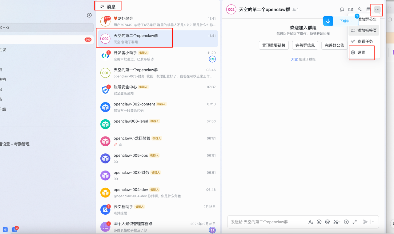 在群聊里试着发一句:@你的小龙虾机器人 你好呀!